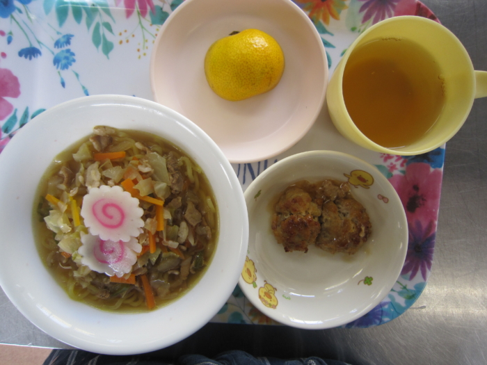 今日の給食は、野菜たっぷり醬油ラーメン、肉団子の甘辛煮、フルーツ・みかんです。