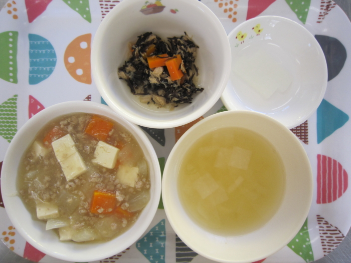 今日の給食は、マーボー丼、ひじきのサラダ、大根の味噌汁です。
