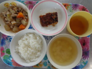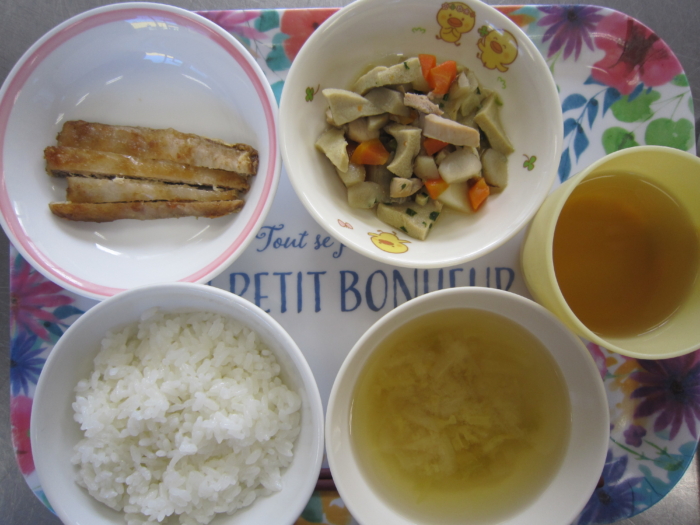 今日の給食は、ごはん、さんまの蒲焼き、高野豆腐の煮物、白菜の味噌汁です。