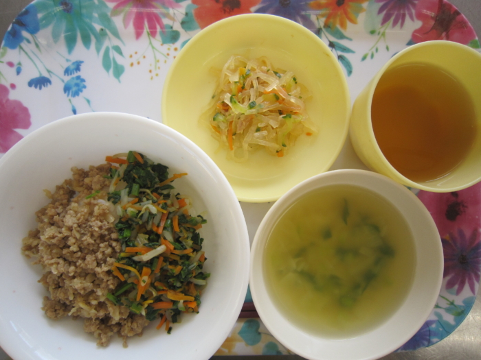 今日の給食は、ビビンバ丼、春雨サラダ、ワンタンスープです。