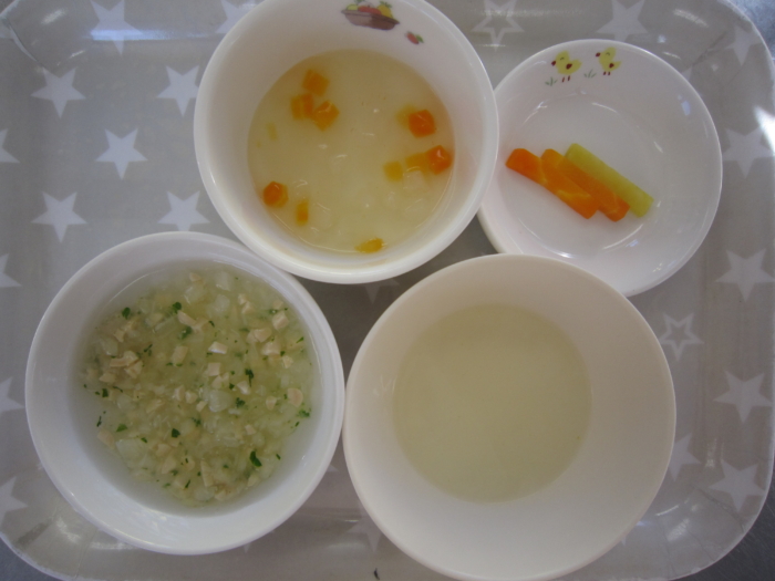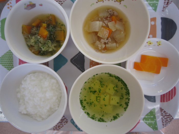 離乳食(中期)は、大豆と野菜のトロトロ粥、人参と大根のスープ煮、野菜スープ、さつま芋・人参スティックです。