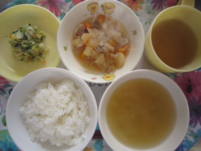 今日の給食は、ごはん、豚バラと大根の煮物、胡麻和え、さつま芋の味噌汁です。