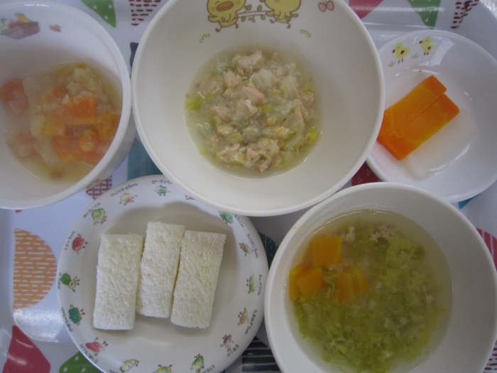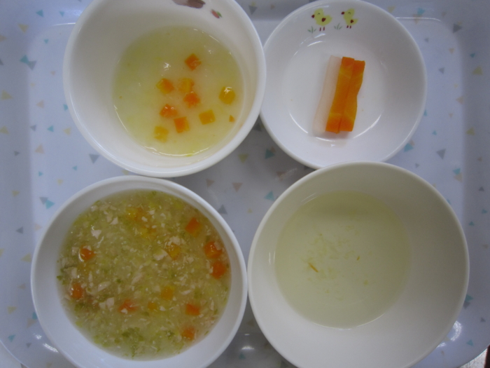 離乳食(中期)は、鮭と野菜のあんかけ粥、人参とキャベツのスープ煮、野菜スープ、人参・大根スティックです。