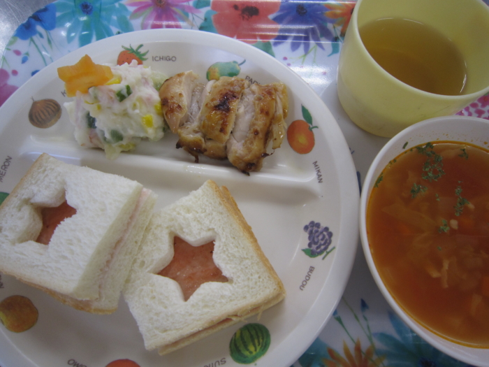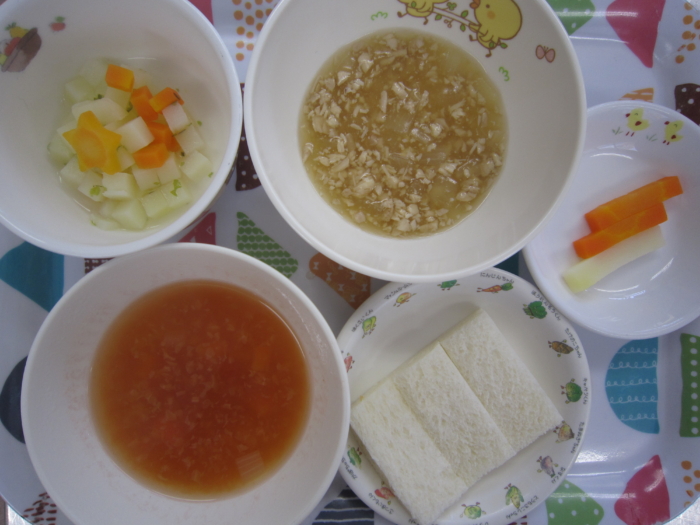 離乳食(後期)は、食パン、鶏肉の旨煮、ポテトサラダ、ミネストローネスープ、人参・じゃが芋スティックです。