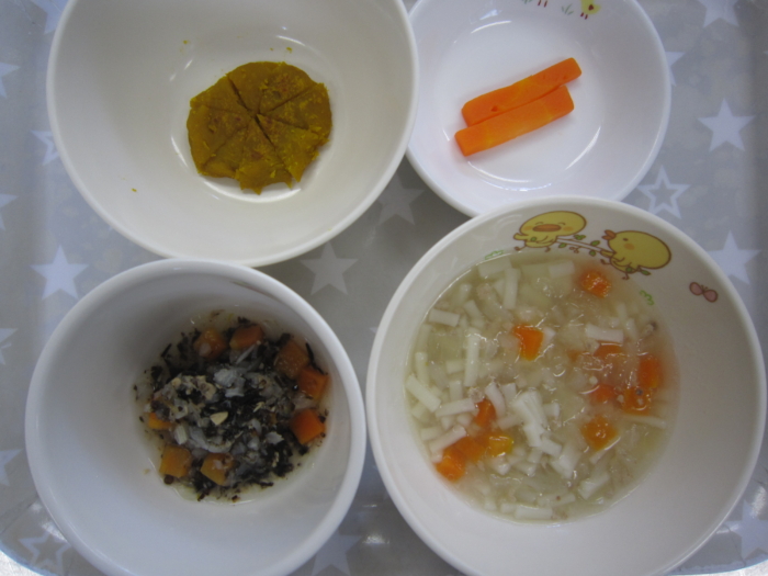 離乳食(後期)は、味噌野菜煮込みうどん、ひじきの中華和え、南瓜のお焼き風、人参スティックです。