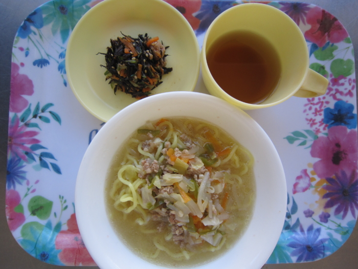 今日の給食は、味噌野菜ラーメン、ひじきのサラダです。