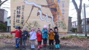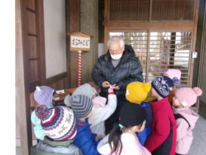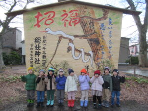 今日は、総社神社に行ってお願い事をしたり、お世話になっている洋三先生が描いた大きな絵馬を見てきました。また、園長先生が子どもおみくじを引いてくれました。健康な1年でありますように。