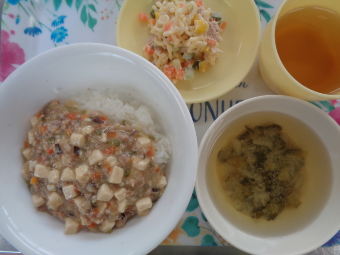 今日の給食は、マーボー丼、マカロニサラダ、小松菜の味噌汁です。