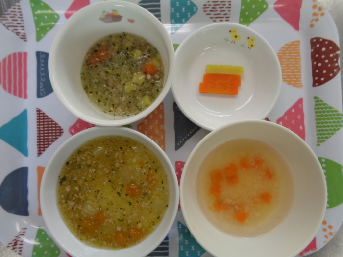離乳食(後期)は、そぼろあんかけ粥、温野菜サラダ、キャベジンスープ、さつま芋・人参スティックです。