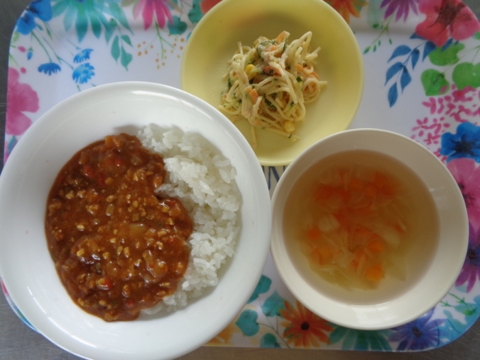 今日の給食は、キーマカレーライス、スパゲティサラダ、キャベジンスープです。