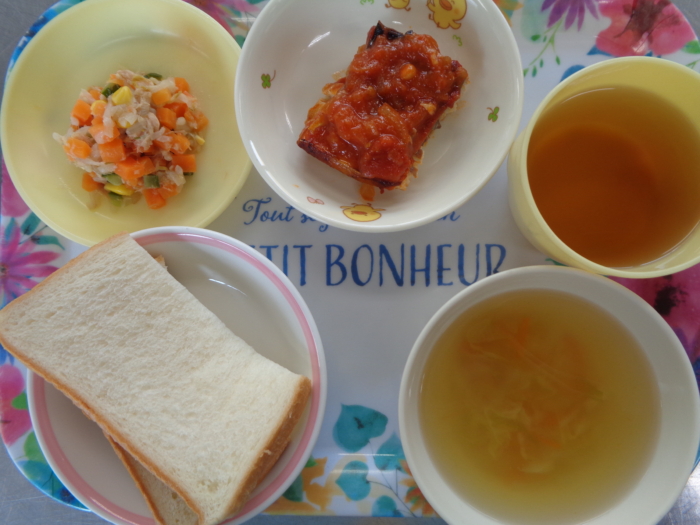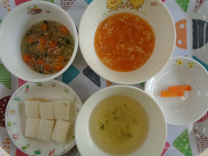 離乳食(後期)は、食パン、白身魚のトマト煮、人参サラダ、春キャベツのスープ、人参スティックです。