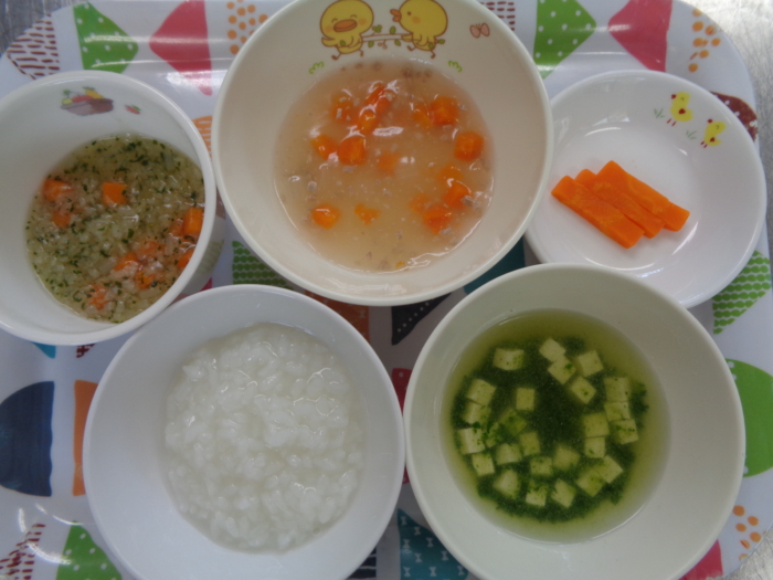 離乳食(後期)は、全粥、豚肉と野菜の味噌煮、キャベツのくたくた和え、小松菜の味噌汁、人参スティックです。