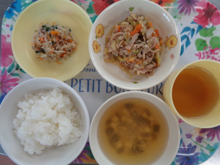 今日の給食は、ごはん、回鍋肉、ゆかり和え、小松菜の味噌汁です。