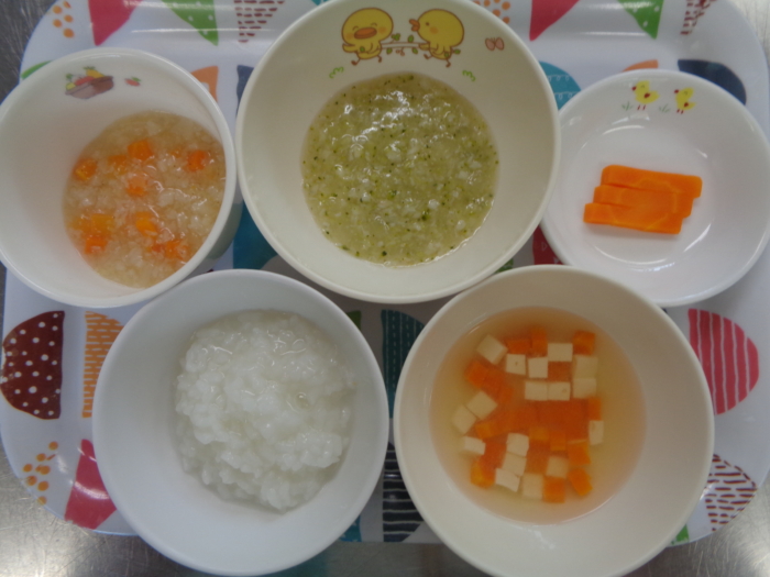 離乳食(後期)は、全粥、白身魚の味噌煮、キャベツと胡麻の和え物、人参の味噌汁、人参スティックです。