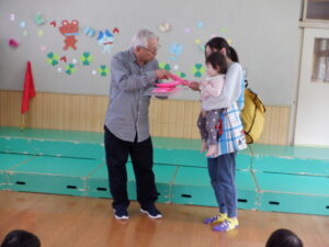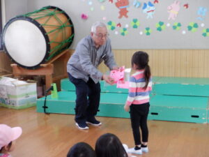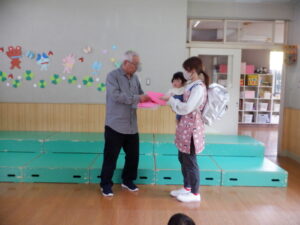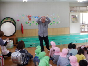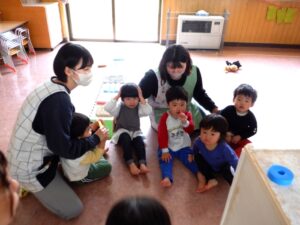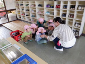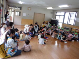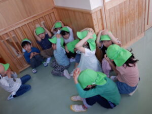 今日は、地震を想定した避難訓練を行いました。放送が聞こえるとすぐに遊びや活動をやめて保育者のそばに集まった子どもたち。今日はホールに避難しました。