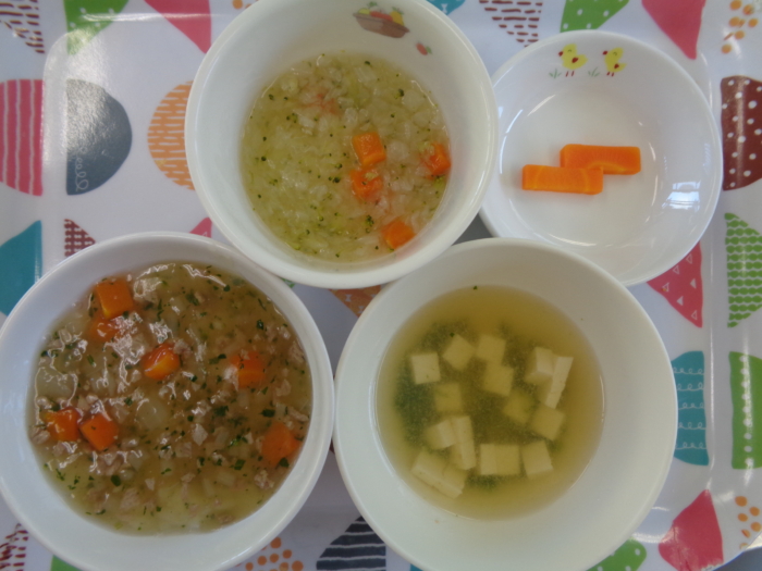 離乳食(後期)は、煮込みあんかけ粥、キャベツのサラダ、豆腐の味噌汁、人参スティックです。