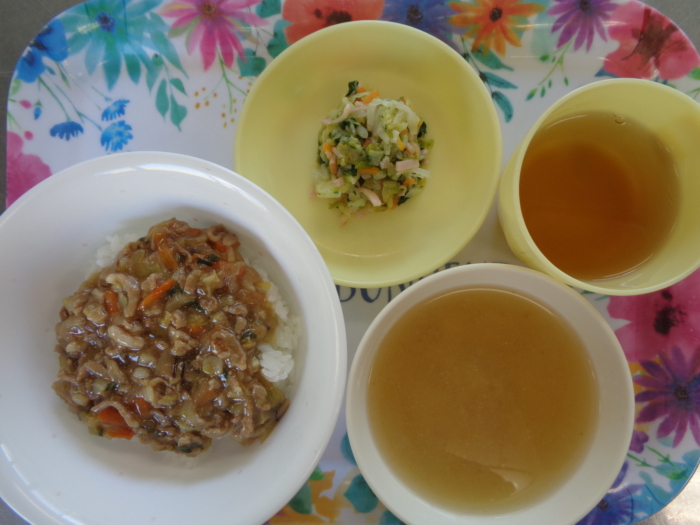 今日の給食は、中華丼、キャベツとハムのサラダ、なめこの味噌汁です。