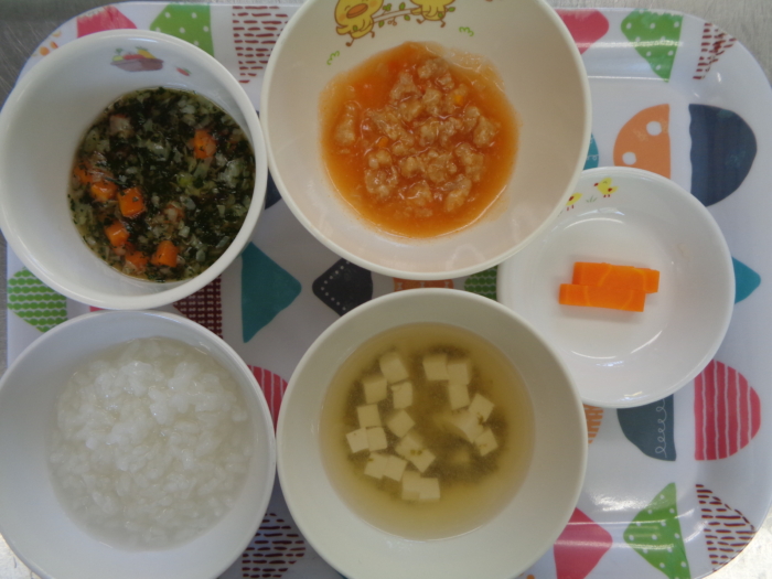 離乳食(後期)は、全粥、ベビー肉団子、小松菜のお浸し、豆腐とわかめの味噌汁、人参スティックです。