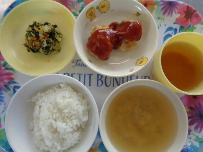 今日の給食は、ごはん、肉団子の甘酢煮、小松菜のお浸し、豆腐とわかめの味噌汁です。