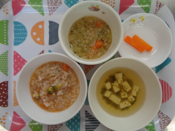 離乳食(後期)は、トマト入り煮込み粥、ツナサラダ、豆腐のスープ、人参スティックです。