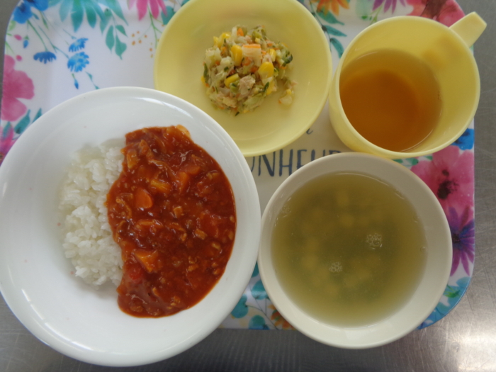今日の給食は、ハヤシライス、ツナサラダ、豆腐の中華スープです。
