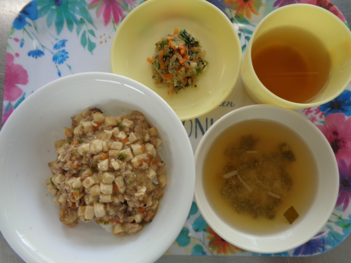 今日の給食は、マーボー丼、三色ナムル、小松菜の味噌汁です。