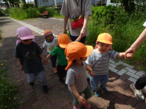 今日は、きりんくみとこあらくみが手をつないで、沼田公園までお散歩に出かけました♪りすくみは初めて手をつないで遊歩道を歩きました。きりんくみのお兄さん・お姉さんが上手なエスコートしてくれ、頼もしかったです。公園ではかけっこをしたり草花で遊んだり、思いきり体を動かして楽しみました✿