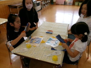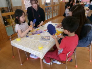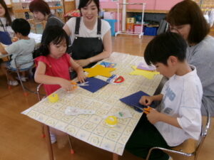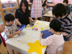 今日は、ぞうくみの保育参観・懇談会がありました。朝の会では『これはのみのぴこ』の詩の暗唱を披露しましたよ。その後は七夕製作をしました。はさみを使って、らせん状に切ったり、おりがみをじゃばらに折ったり、お家の人と一緒に楽しそうに作っていましたよ。