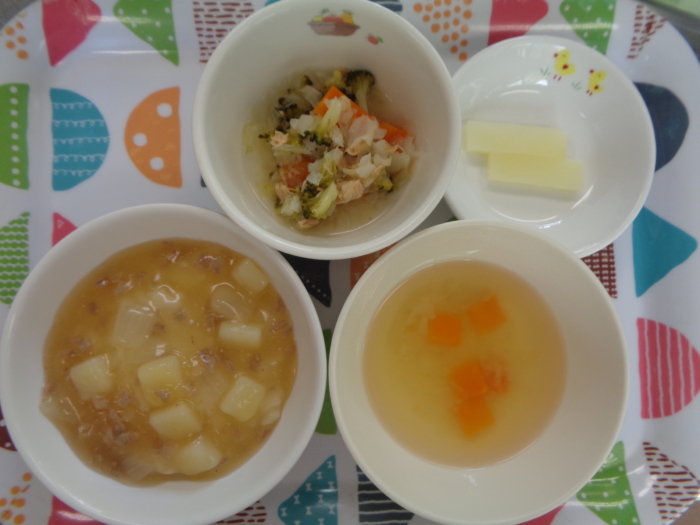離乳食(後期)は、豚肉と野菜のあんかけ粥、温野菜サラダ、キャベジンスープ、じゃが芋スティックです。
