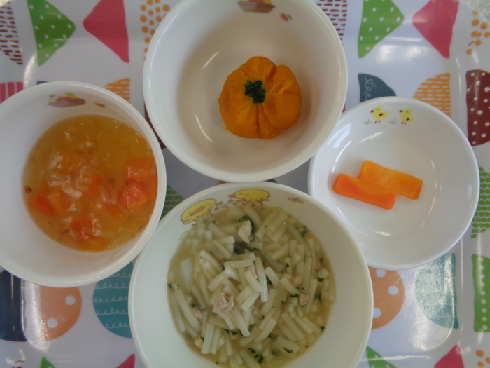 離乳食(後期)は、味噌煮込みうどん、人参のおかか和え、南瓜の茶巾、人参スティックです。