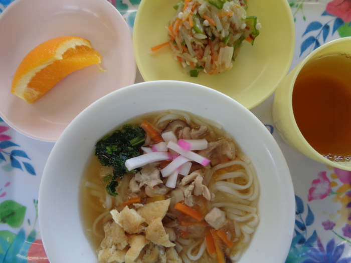 今日の給食は、きつねうどん、オクラのおかか和え、フルーツ・オレンジです。