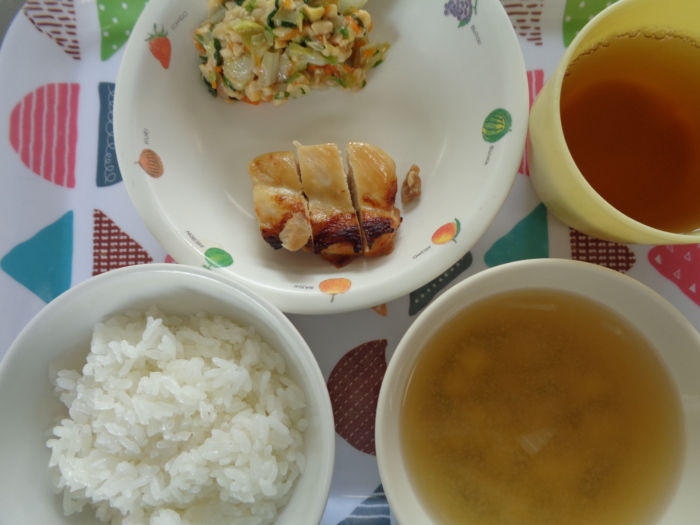 今日の給食は、ごはん、鶏肉の照り焼き、納豆和え、わかめの味噌汁です。