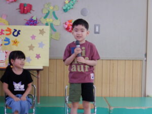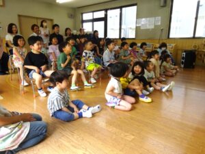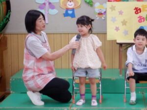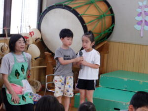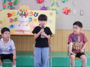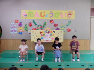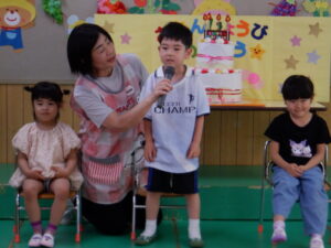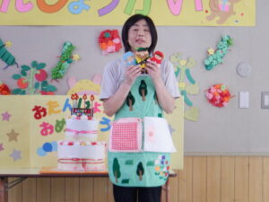 今日は、6月生まれのお友だちのお誕生会がありました。誕生児はスタンバイしている時は「ドキドキする~」と緊張気味でしたが、入場の音楽が鳴ると笑顔で登場してくれました。会ではみんなにお祝いの歌をうたってもらったり、園長先生に誕生カードのプレゼントをもらっらりして喜んでいましたよ。先生からのお楽しみのプレゼントは「赤ずきんちゃん」のエプロンシアターでした。おおかみの登場に盛り上がり、歓声も上がっていました♪