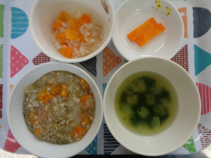 離乳食(後期)は、鶏そぼろあんかけ粥、ツナサラダ、海藻スープ、人参スティックです。