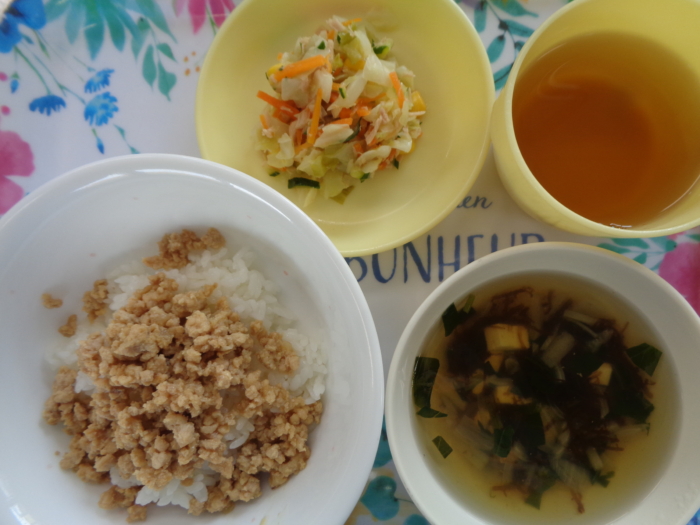 今日の給食は、鶏そぼろ丼、ツナサラダ、もずくスープです。