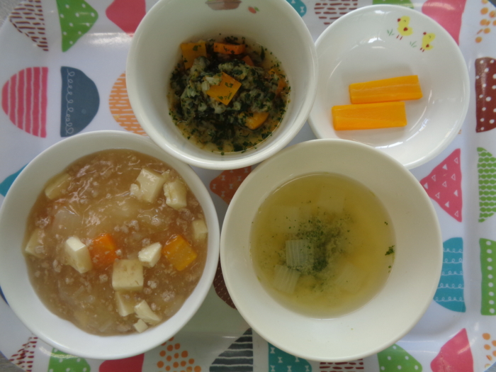 離乳食(後期)は、豆腐のあんかけ粥、キャベツの磯和え、玉ねぎの味噌汁、人参スティックです。