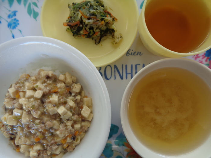 今日の給食は、マーボー丼、キャベツの磯和え、えのきの味噌汁です。