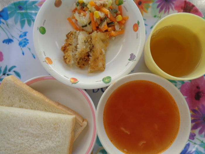 今日の給食は、食パン、カレイの香草パン粉焼き、人参サラダ、ミネストローネスープです。