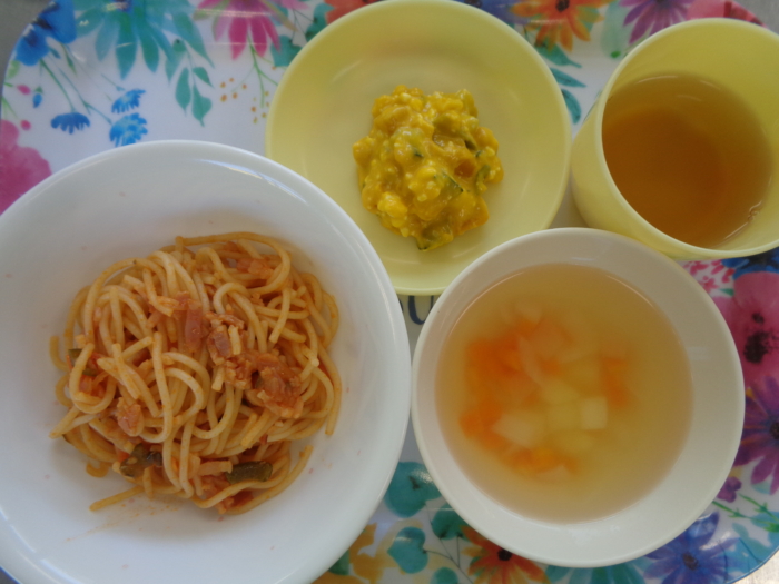 今日の給食は、スパゲティナポリタン、南瓜サラダ、コロコロスープです。