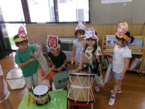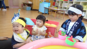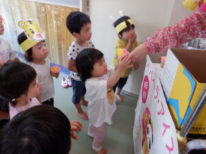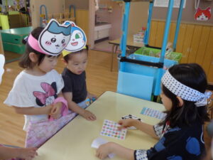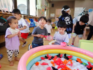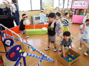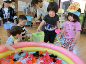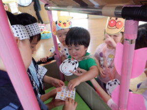 毎年子どもたちが楽しみにしている、夏まつりが始まりました。ぞう組さんが、お面屋さんや金魚すくいやさんになって、他のクラスの子どもたちに優しく声をかけてくれていました。的当てやたこ焼きゲーム、トンネルコーナーも楽しんでいましたよ☆