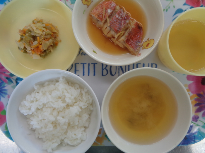 今日の給食は、ごはん、赤魚の煮付け、いんげんの胡麻和え、玉ねぎの味噌汁です。