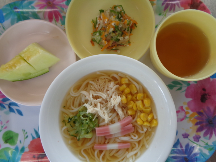 今日の給食は、冷やしうどん、オクラのおかか和え、フルーツ・メロンです。