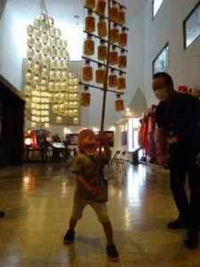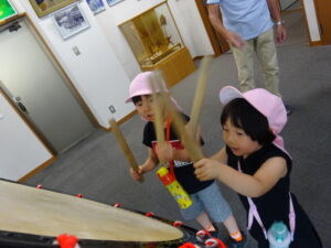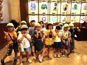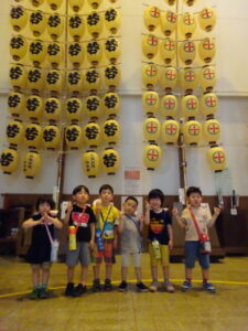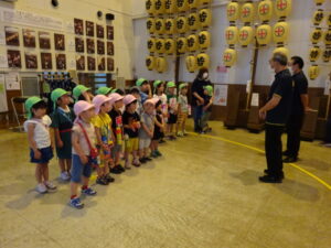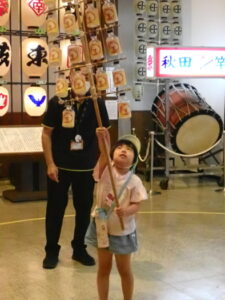 きりんくみとぞうくみでバスに乗ってねぶり流し館に行ってきました。竿燈まつりについて話を聞いたり、実際にミニ竿燈をあげさせてもらったりしました。また、保育園の提灯を見つけて、喜んでいましたよ。そして、ぞうくみさんは竿燈本番に向けて気持ちが高まったようでした。