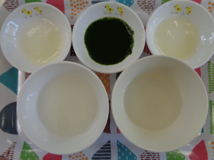 離乳食(初期)は、10倍粥、じゃが芋ペースト、ほうれん草ペースト、キャベツペースト、野菜スープです。