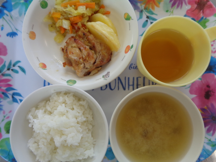 今日の給食は、ごはん、鶏肉のねぎ塩たれ、野菜のカレーソテー、フライドポテト、茄子の味噌汁です。