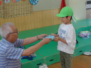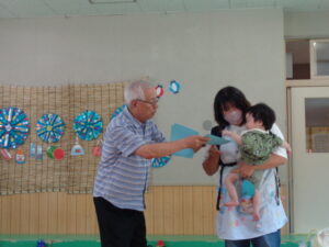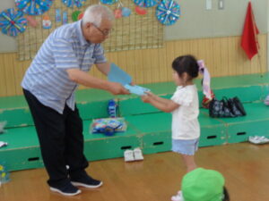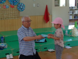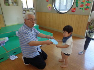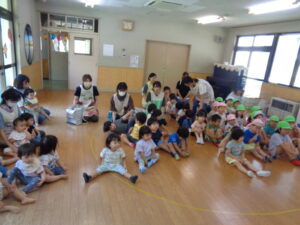 今日は、地震の後に厨房から火災が発生したという想定で、避難訓練を行いました。本来ならば園庭に避難し、火災が大きくなったということでさらに遊歩道へ避難する予定でしたが、熱中症対策のためホールに避難しました。園長先生から「自分の命が大事」というお話をしてもらい、うなずいて聞いていた子どもたちです。