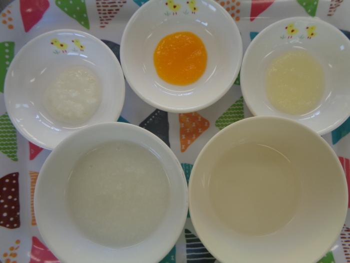 離乳食(初期)は、10倍粥、白身魚ペースト、人参ペースト、キャベツペースト、野菜スープです。