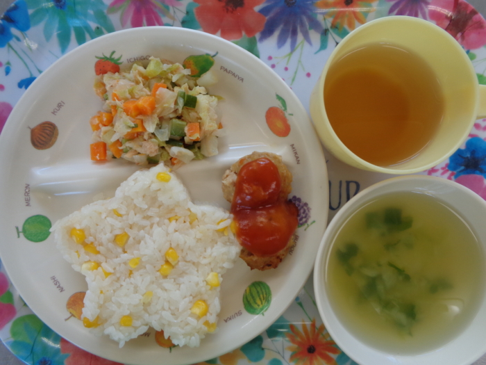 今日の給食は、とうもろこしごはん、肉団子の甘酢あんかけ、カラフルサラダ、ワンタンスープです。