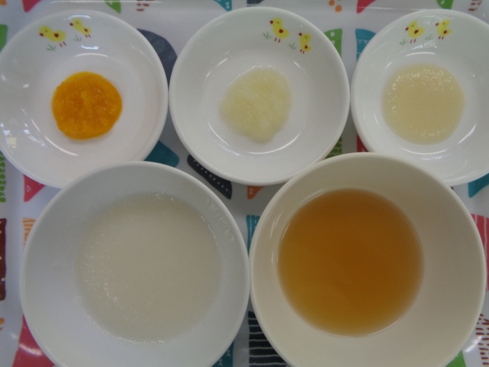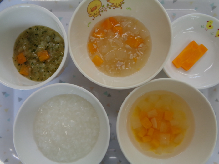 離乳食(初期)は、10倍粥、白身魚ペースト、キャベツペースト、南瓜ペースト、野菜スープです。