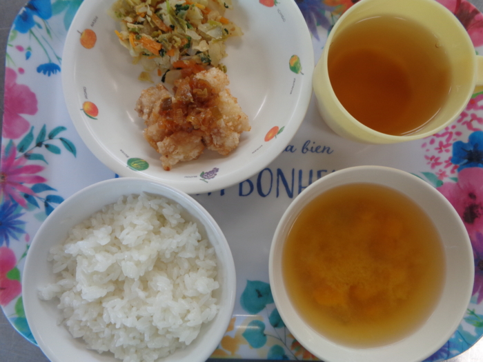 今日の給食は、ごはん、油淋鶏、胡麻和え、南瓜の味噌汁です。